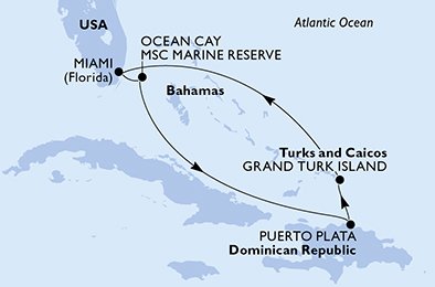 - Miami -> Ocean Cay MSC Marine Reserve Bahamas -> tengeren -> tengeren -> Puerto Plata Dominican Republic -> Grand Turk Island Turks and Caicos -> tengeren -> Miami United States