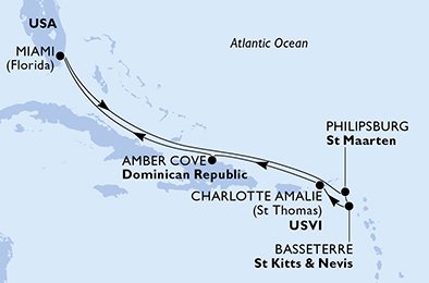 - Miami -> tengeren -> tengeren -> Philipsburg St. Maarten -> Basseterre St Kitts & Nevis -> Charlotte Amalie (St. Thomas) Virgin Islands -> Amber Cove Dominican Republic -> tengeren -> Miami United States